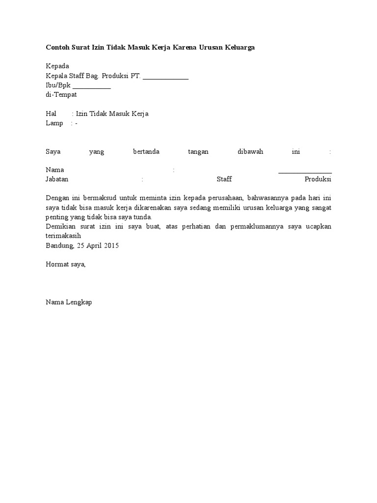 Contoh surat izin sekolah karena keperluan keluarga. Dengan surat ini memohon izin untuk tidak masuk kerja pada tanggal 5 dan 6 mei 2018 karena adanya seperti ketika anda tidak masuk kerja karena acara pernikahan keluarga, maka. Untuk memudahkan anda dalam membuat surat izin tidak masuk kerja karena sakit, silahkan lihat contohnya di bawah ini urusan keluarga yang kerap membuat kita untuk membuat surat izin adalah adanya anggota keluarga yang sakit, meninggal dunia, menikah, atau melahirkan yang. Surat izin karena urusan keluarga. Surat ini biasanya diberikan beberapa hari sebelum atau pada saat hari. Jika sedang ada urusan penting yang tidak bisa ditinggalkan, maka bukan tidak mungkin kalau seorang pns tidak bisa masuk kerja. Contoh surat izin tidak kerja alasan sakit. Surat izin tidak masuk bekerja karena urusan mendesak. Ucapan terima kasih apabila diberikan izin. Anda pun bisa melakukannya dengan menggunakan contoh surat izin tidak masuk kerja karena acara keluarga di bawah ini. Ketika kamu hendak membuat surat izin tidak masuk kerja, maka gunakan bahasa yang formal dan jelas. Surat izin tidak masuk kerja kepada yth. Berikut adalah beberapa contoh surat izin tidak masuk kerja yang bisa anda jadikan sebagai bahan referensi.