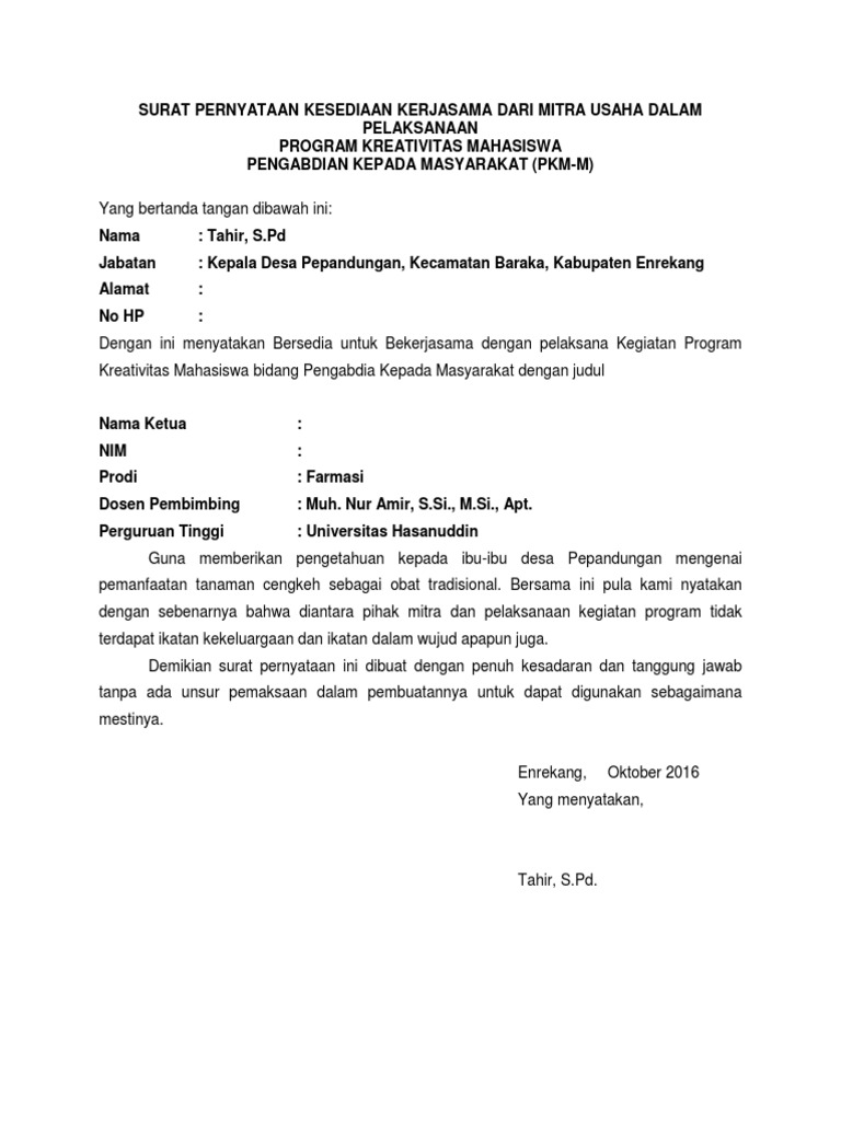 Contoh Surat Kerjasama Mitra Pkm from imgv2-1-f.scribdassets.com Sebagai keterangan, surat pernyataan sering kali digunakan dalam berbagai bentuk dan kebutuhan. Contoh surat perjanjian kerjasama bisnis investasi dan bagi hasil yang mudah untuk dibuat dan dipakai untuk kerjasama kemitraan dan lainnya. Kerjasama yang menguntungkan antar kedua belah pihak memang seringkali dilakoni oleh para pengusaha demi memajukan perusahaan mereka. Setelah mengetahui cara pembuatan surat kesepakatan, apakah anda masih bingung atau belum ada gambaran? Unduh sebagai docx pdf txt atau baca online dari scribd. Surat perjanjian antar rekan bisnis juga sangat penting karena menjadi sebuah bukti tertulis tentang sebuah kesepakatan yang telah dibuat dari kedua belah pihak. Contoh surat perjanjian kerjasama pembiayaan dana proyek pembangunan pengaspalan jalan desa berikut ini adalah contoh tentang contoh surat perjanjian kerjasama pembiayaan dana proyek pembangunan pengaspalan jalan desa. Berikut ini adalah contoh surat kerjasama sponsorship selengkapnya untuk anda.